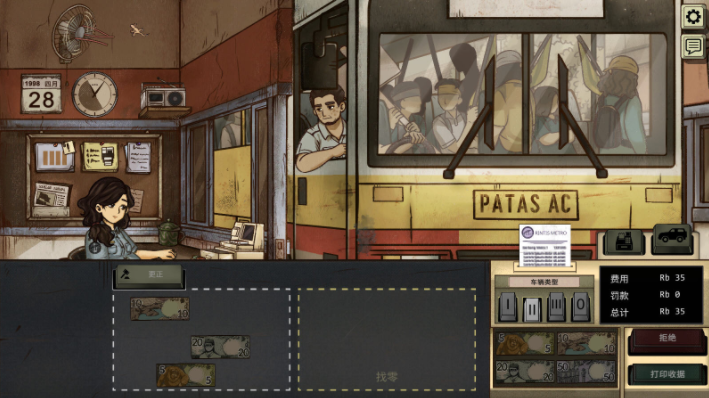 1998收费员的故事采用了融合圆点纹理、旧纸质感与蓝色滤镜的独特视觉风格,精准复现了九十年代印刷品的时代特征。玩家扮演的黛薇需要在高速公路收费站这个微小而关键的位置上,严格检查过往车辆与人员的证件,并决定是否放行。不同车辆收费标准各异,特种车辆则免费。随着游戏推进,检查流程会从简单的收费找零,逐渐扩展到验钞、使用金属探测器搜查违禁品、核对证件信息、分发传单等环节。面对求助者、难民、士兵等形形色色的人物,玩家每一次放行或拒绝的选择,都可能引发连锁反应,左右后续剧情的走向。