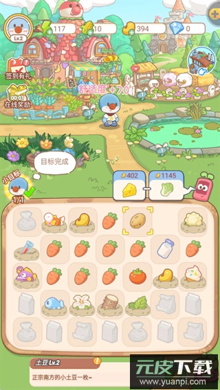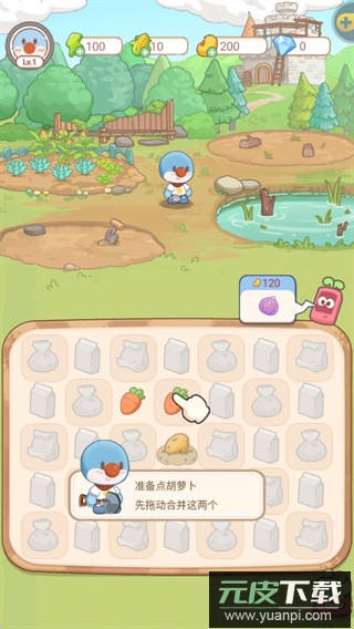 1、游戏初期通过拖动合并胡萝卜等作物,开启模拟经营的合成玩法。