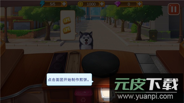 5、接待你的第一位顾客——一只可爱的小狗,根据它的需求制作煎饼,点击面团即可开始操作;