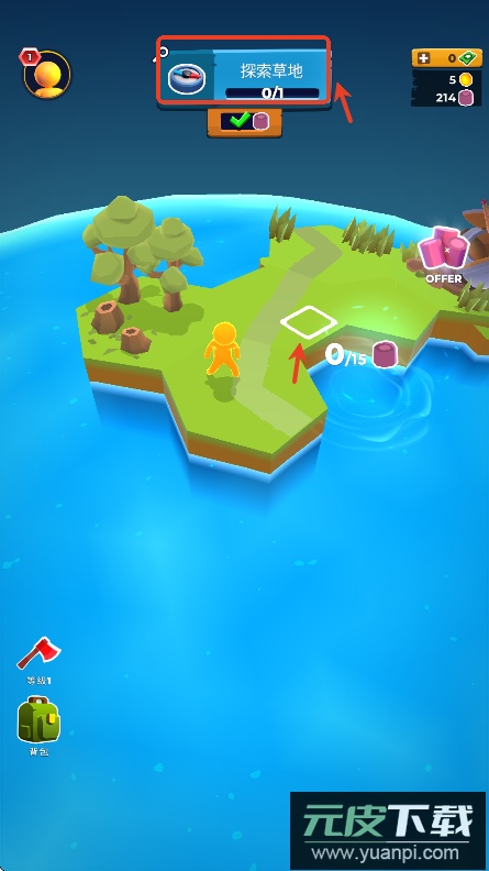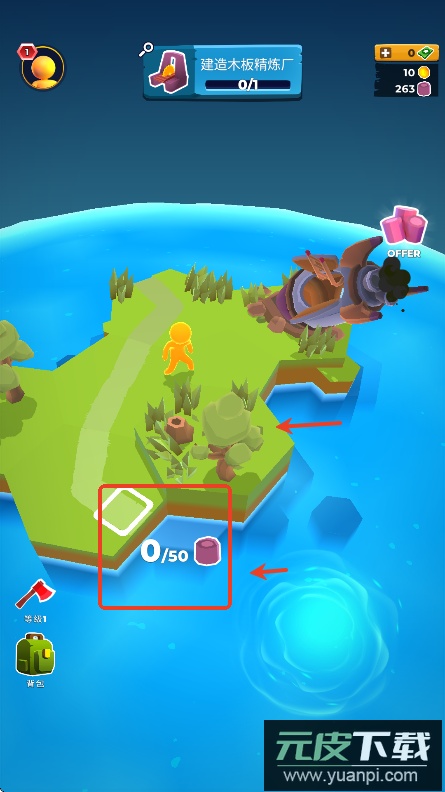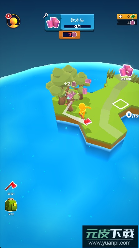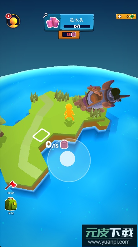 请跟随界面上方的任务指引逐步推进;第一步是使用斧头砍伐树木。