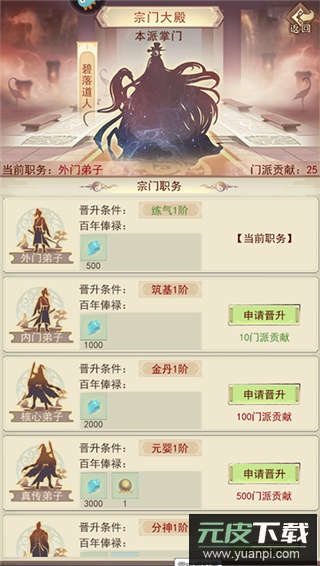 3、职务晋升:当境界达到要求后,可在宗门大殿消耗贡献提升职务;职务等级直接影响百年俸禄的数量,并决定能否进入门派内的特定区域。