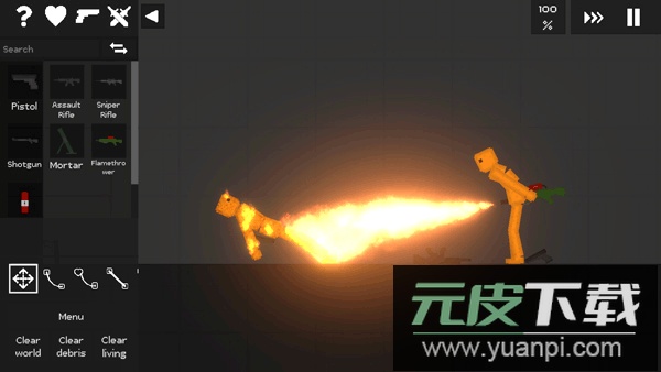 木材、橡胶、塑料与人物角色均易于燃烧,玩家可点燃它们并观察其逐渐炭化的过程。