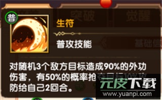 普通攻击:随机对三名敌人造成90%伤害,50%概率提升自身功力;
