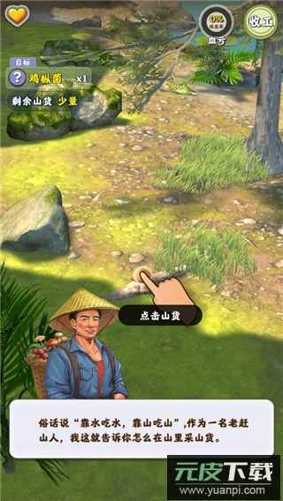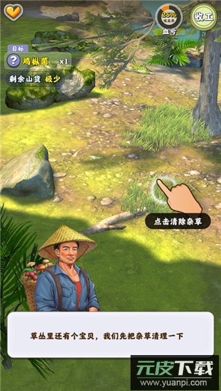 3. 发现山货后点击采摘,遇到杂草可点击清除;当前区域清理完毕会有提示,随后可前往下一区域继续收集;