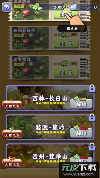 2. 选择目标地图,不同地图产出不同山货,进山需支付门票,点击出发即可;