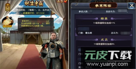 当服务器满足特定条件后,将开放联盟争霸玩法,即盟战。联盟等级达到三级即可参与。盟战于每周一、三、五正式开战,其余时间为备战日。备战日期间可派遣门客并配置一个锦囊助战。出战顺序依据联盟职位高低,从盟主、副盟主、精英到成员依次进行,不同职位享有不同的战力加成。每名门客每月仅能出战一次,需要与盟友协同布阵,共同争取胜利。