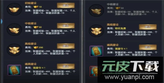 联盟成员每日可进行建设,分为初级、中级、高级、道具及高级道具建设五种方式。前三种消耗元宝,后两种则需使用强盟令或高级强盟令。强盟令可通过联盟经验冲榜活动获取。每人每日仅能选择一种建设方式。若已开通月卡、季卡或年卡,可享受特权建设,效果与高级建设相同且无需元宝,完成后仍可进行道具建设。每日建设人数存在上限,与联盟成员上限一致,额满后其他成员将无法继续建设。