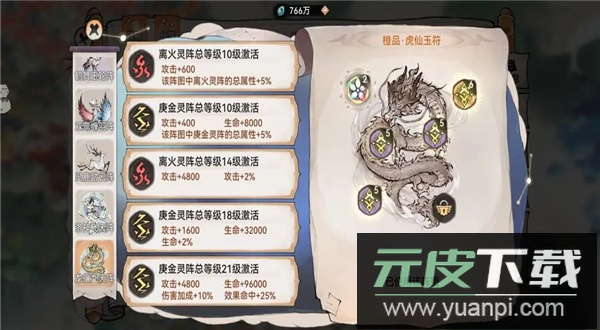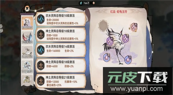 4、玉符阵图:玉符优先选择玄龟与蛇龟,初期可用一阶红色玉符过渡,待符箓等级提升后更换为二阶橙色或红色;阵图有两种方案: