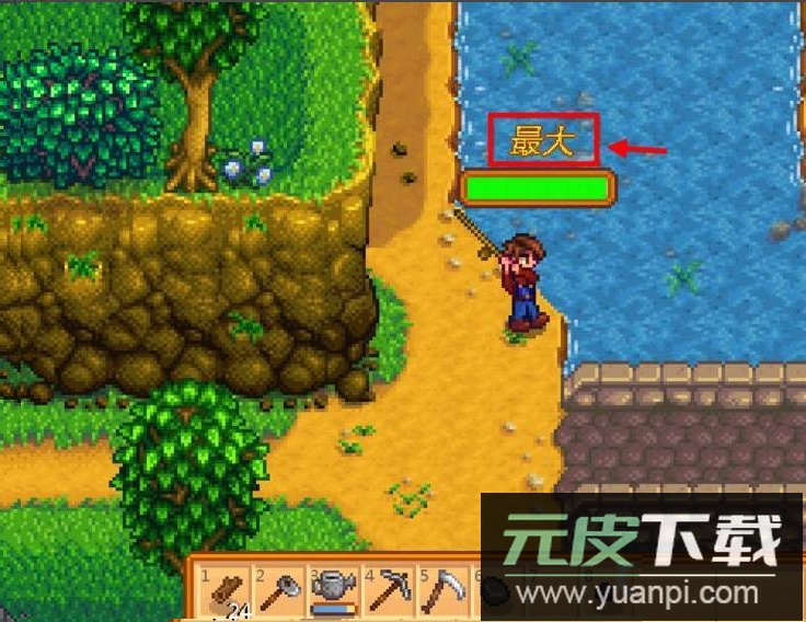 2、点击水面区域,绿色蓄力条满格显示“最大”时,即可抛出鱼竿。