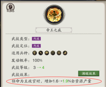 英雄武技适配:内政型英雄的武技在特定职位上有特殊效果,例如曹丕的帝王之威,在任命为主政官时可提升全资源产量。