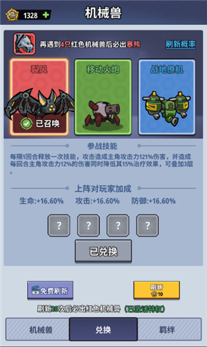 参与关卡战斗和在商店购买,都可以获取机械勋章道具,消耗道具就能刷新兑换机械兽。前期要每天坚持参与关卡战斗,积攒足够的机械勋章道具,尽快把机械兽提升到红品级别,解锁更高等级的技能效果;