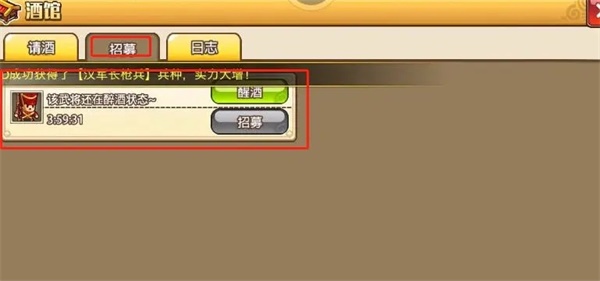 猜拳最终获胜后,武将会进入【招募】队列,需要等待一定时长后才能完成招募,可消耗解酒药道具缩短等待时长;