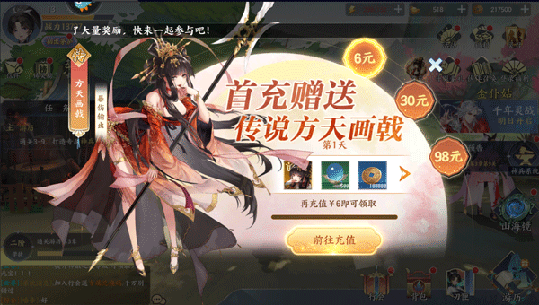4、首次充值优先选每日特惠礼包,可以拿到传说级刃灵方天画戟,它自带超高暴击和爆伤输出,能帮你在前期快速压制敌方,更快推进关卡进度;