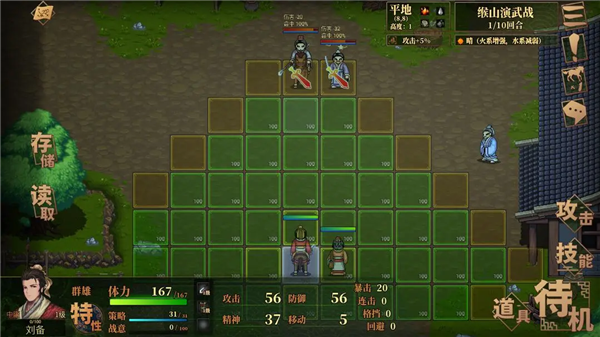 4. 血量与策略值分配:敌方通常会攻击防御最低的单位,因此增加血量的道具建议分配给简雍;增加策略值的道具可优先给予刘备,以支持其施展群体技能。
