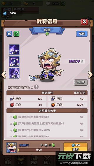 乐进:技能先登死士掷出的巨型飞刀数量增加一把。