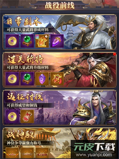 战役模块包含了日常副本、过关斩将等丰富内容。日常副本随战力解锁更高难度,提供各类养成素材;过关斩将玩法允许借用好友的武将协同作战,既能获得高级招募令,也增强了互动性;远征讨伐会奖励大量铜币与威望,配置拥有治疗能力的武将有助于更稳定地通关。