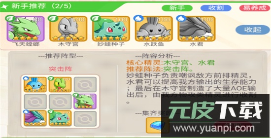 推荐阵法:突击阵。妙蛙种子能吸引敌方前排火力,水君可增强我方生存能力,木守宫提供范围伤害后,再由物理攻击型精灵完成收割。