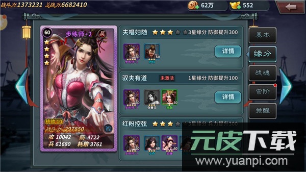 2、缘分系统:22级开启,通过提升缘分等级来增强属性;收集有羁绊关系的武将并提升其星级,能够激活更强大的缘分效果。
