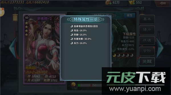 5、觉醒:60级开启,消耗“道石”对武将进行觉醒,觉醒后可大幅提升基础属性与专属觉醒属性。