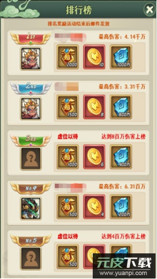 3. 排行榜将根据玩家在活动中单次造成的最高伤害进行统计,活动结束后奖励会通过邮件发放给御兽师,排名信息将展示至下一次活动开启;