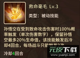 提升悟空生存能力,血量较高时受致命伤害可保留20%生命,状态较差时则保留少量生命。仅触发一次,较惧怕多段伤害或追击类攻击。