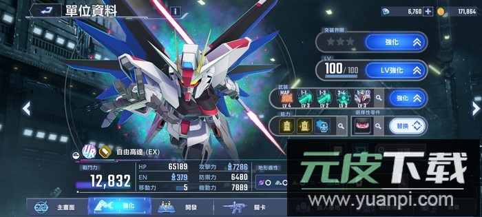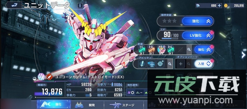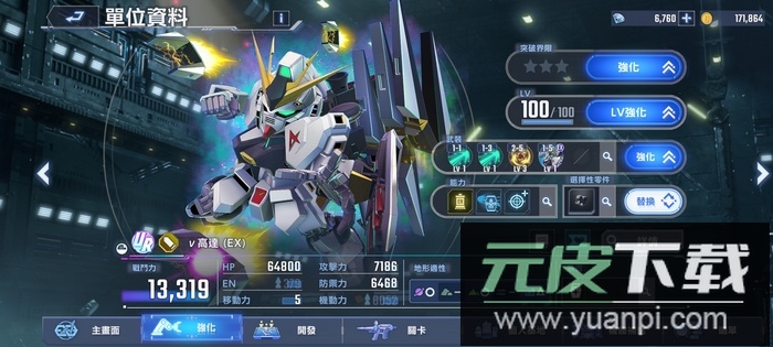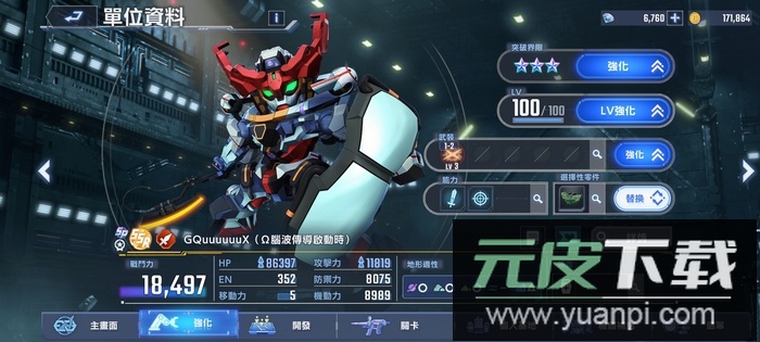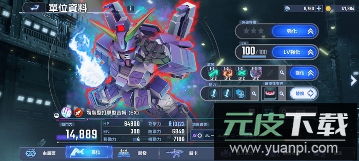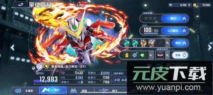 点击菜单界面底部的“强化”,可进入机体、角色与支援者的强化界面。在机体数据界面,可进行界限突破、等级提升、武装强化以及更换可选零件等操作。