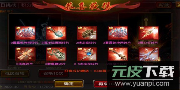 挑战过程中根据造成的伤害累计积分,积分可在商店兑换神器;红色神器仅需积分即可换取,紫色神器则需额外消耗寻宝令。下图展示了五百积分进行低级召唤的界面。