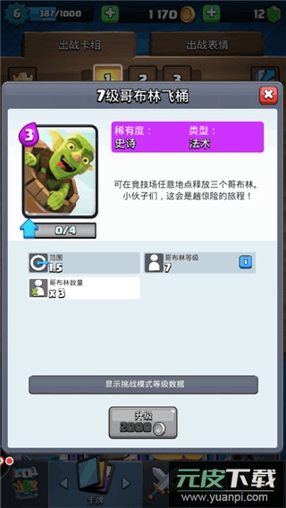 哥布林飞桶:消耗三点圣水,可投掷至战场任意位置,通常直接用于袭击对方公主塔;移动迅捷,对建筑伤害突出,是拆塔的核心手段。