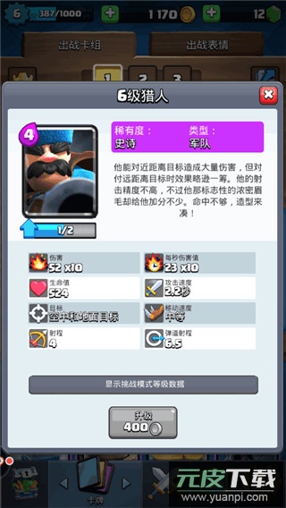 猎人:需要四点圣水,对近距离目标伤害极高,主要用于防御敌方推进及处理空中单位;不擅长应对大规模兵团,可根据使用习惯替换为骑士、巨人或女武神等卡牌。