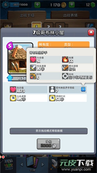 哥布林小屋:消耗五点圣水,建筑可持续存在五十秒,期间每隔数秒产出一名哥布林投矛手,总计可产出十一个单位;能持续骚扰对手,并对空对地攻击,常与骷髅墓碑配合使用。