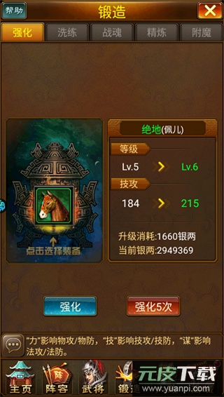 强化能提升装备主属性,最高等级受主角当前等级限制;强化成功率每半小时波动一次,VIP3玩家可消耗金币锁定100%成功;VIP3以上玩家强化时有几率触发暴击,一次性提升2级。