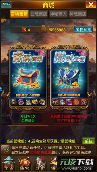 青铜宝箱每日提供5次免费购买,之后需消耗银两,每次一万两;除固定获得2点魂外,还有几率开出各类道具、材料、武将魂魄或完整武将;完整武将与装备的抽取概率合计为74%,其中红色品质概率为10.8%,紫色为28.7%,蓝色为10%;武将碎片与装备碎片的抽取概率合计为39%,红色碎片概率为9%,紫色为11%,蓝色为19%。