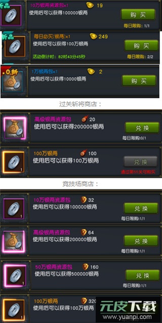 4、利用各类商店进行兑换。当以上途径仍无法满足需求时,你可以使用元宝等货币在游戏商店中直接购买银两;过关斩将商店与竞技场商店也提供银两兑换;此外,开启军功宝箱也有机会获得大量银两。