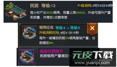 1、发展城池内政是稳定收入的基础。通过提升官府等级来解锁更多民居,并持续升级民居以提高银两产出效率;当民居等级足够高时,即使离线也能收获可观收益。同时,研究科技树中的银两征收技术,或使用民居提升类道具,都能进一步增加银两产量。