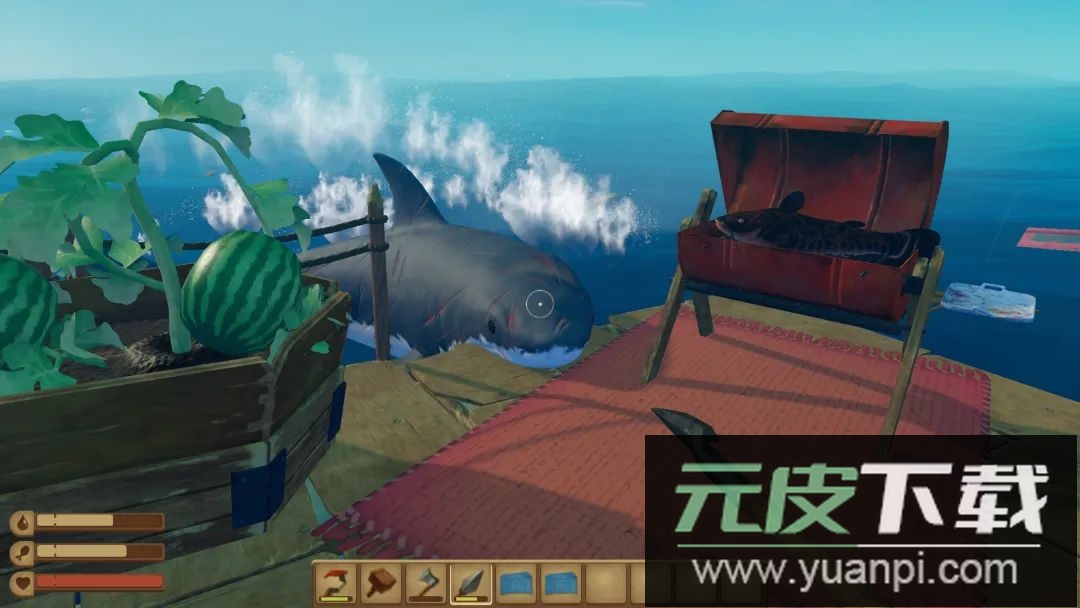 饥饿与口渴值若清零将直接导致死亡;你必须通过钓鱼、种植土豆、制造净水器来维持生命,甚至能用蜂蜜和玻璃罐制作长期保存的食物。而最持续的威胁来自那条神出鬼没的鲨鱼,它会不断撕咬木筏边缘,一旦结构损坏,所有物资都可能沉入海底。