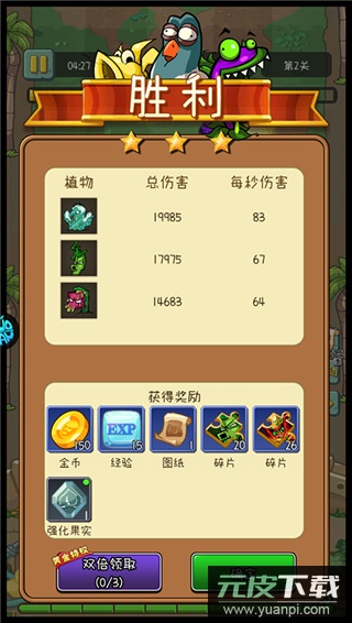4、挑战胜利后可查看各植物卡牌的输出数据,并领取相应奖励;