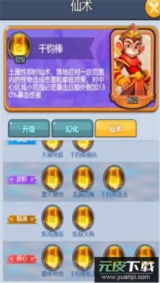 3、孙悟空:土属性即时仙术,落地后对范围内怪物造成伤害与晕眩,中心小范围区域攻击必定暴击并附加130%暴击伤害。
