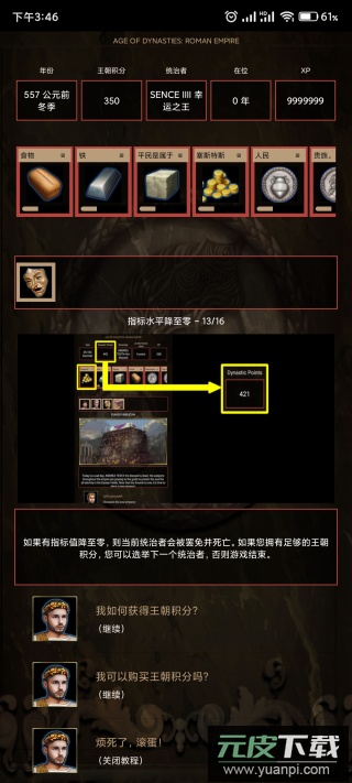 10、假如某项指标降至零点,现任君主将被废黜并死亡。此时你必须消耗王朝积分来选立新君,否则王朝便会走向终结。