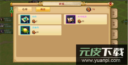 联盟仓库允许成员存入闲置的装备或材料,其他盟友消耗个人贡献值即可取出。联盟商店中可以使用贡献兑换灵兽丹、天书残页等实用道具。