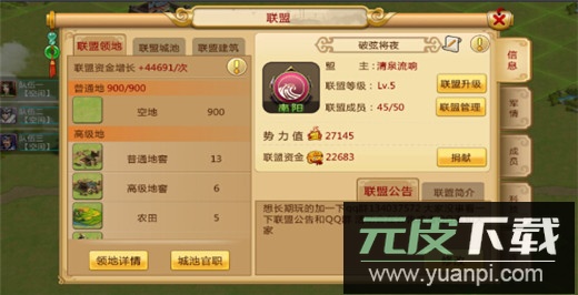 在此界面可以查看联盟的总体势力值与资金状况,成员通过捐献能增加联盟资金。联盟领地显示了当前占领的地块上限;联盟城池则列出所有归属联盟的城池状态;联盟建筑部分标明了各类建筑的位置与等级上限。
