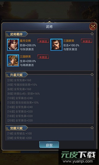 羁绊与天赋强化:特定武将同时上阵可激活羁绊关系,获得独特的属性增益。同时,通过升星与觉醒提升武将天赋,能显著增强其战斗能力与技能效果。