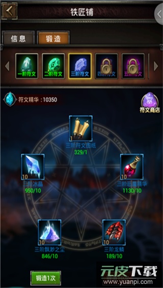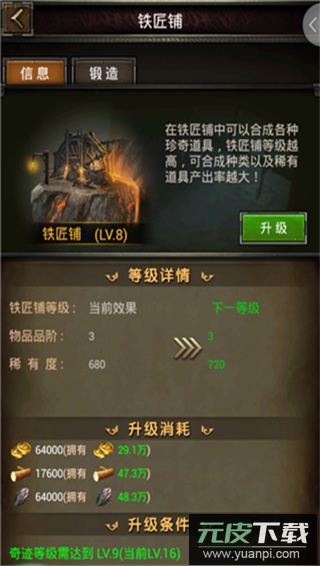 铁匠铺支持合成各类稀有道具,其等级越高,可合成的道具种类与高品质道具产出率也越高。挂机探险时会随机掉落锻造材料,材料等级与英雄突破等级相关联。集齐特定材料后即可进行锻造,成功后会随机获得不同颜色的符文;若锻造失败,则会得到符文精华。符文精华可在符文商店中直接兑换成品符文。