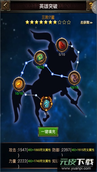 点击界面下方的“突破”按钮即可进入英雄突破界面,将锻造获得的材料一键填入即可进行突破。每个突破阶段包含十颗星,每次突破点亮一颗,当十颗星全部点亮后,英雄便会晋升至下一阶段。