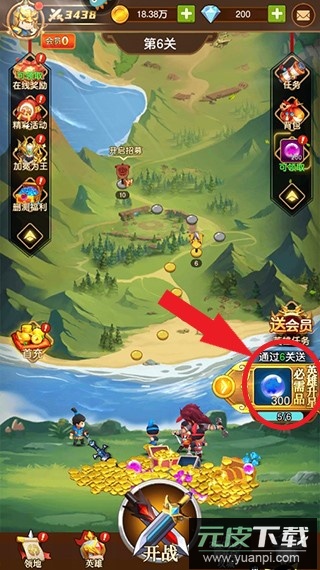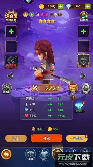 通过第五关后解锁英雄功能,点击下方英雄按钮进入界面,可进行升级、学习技能、更换外观等操作。