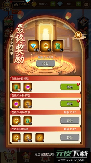 点击左上角在线奖励图标,可根据累计在线时间领取对应的阶段礼包,内容十分丰厚。