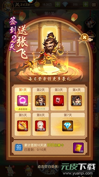 点击背包下方可领取的标识,进入每日签到页面,连续签到可获得张飞等稀有奖励。