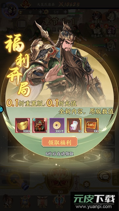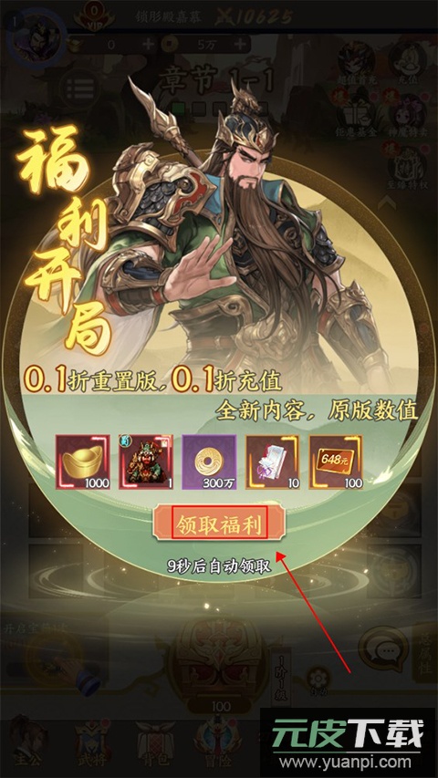1、新手登录即赠福利礼包,包含武将关羽及充值卡等资源;