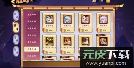 三清商店:可购买家具包;若已获得龙类宠物,则可兑换对应皮肤。三清王座玩法中,战力较低时建议挑战左侧关卡,战力提升后可尝试右侧。