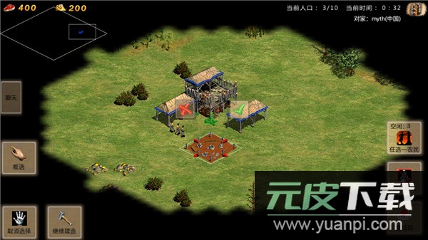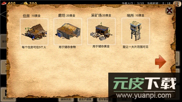 4、选中农民后点击建造按钮,即可选择建造民用设施或军事建筑;