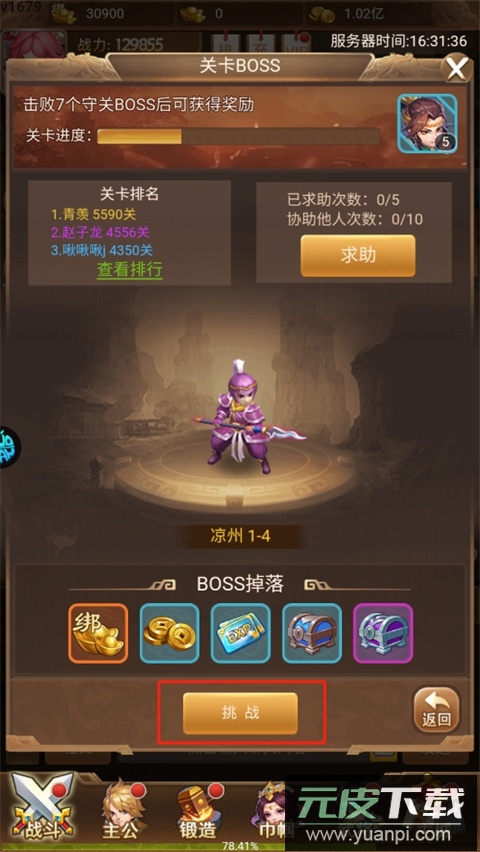 2、在画面底部寻找到挑战按钮,点击即可开启BOSS对战;